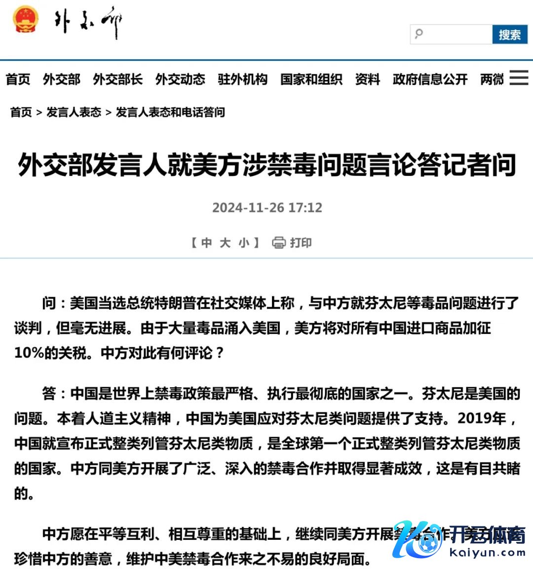 有记者发问:好意思国当选总统特朗普在社交媒体上称,与中方就芬太尼等毒品问题进行了谈判,但毫无发达。由于渊博毒品涌入好意思国,好意思方将对系数中国入口商品加征10%的关税。中方对此有何评述?