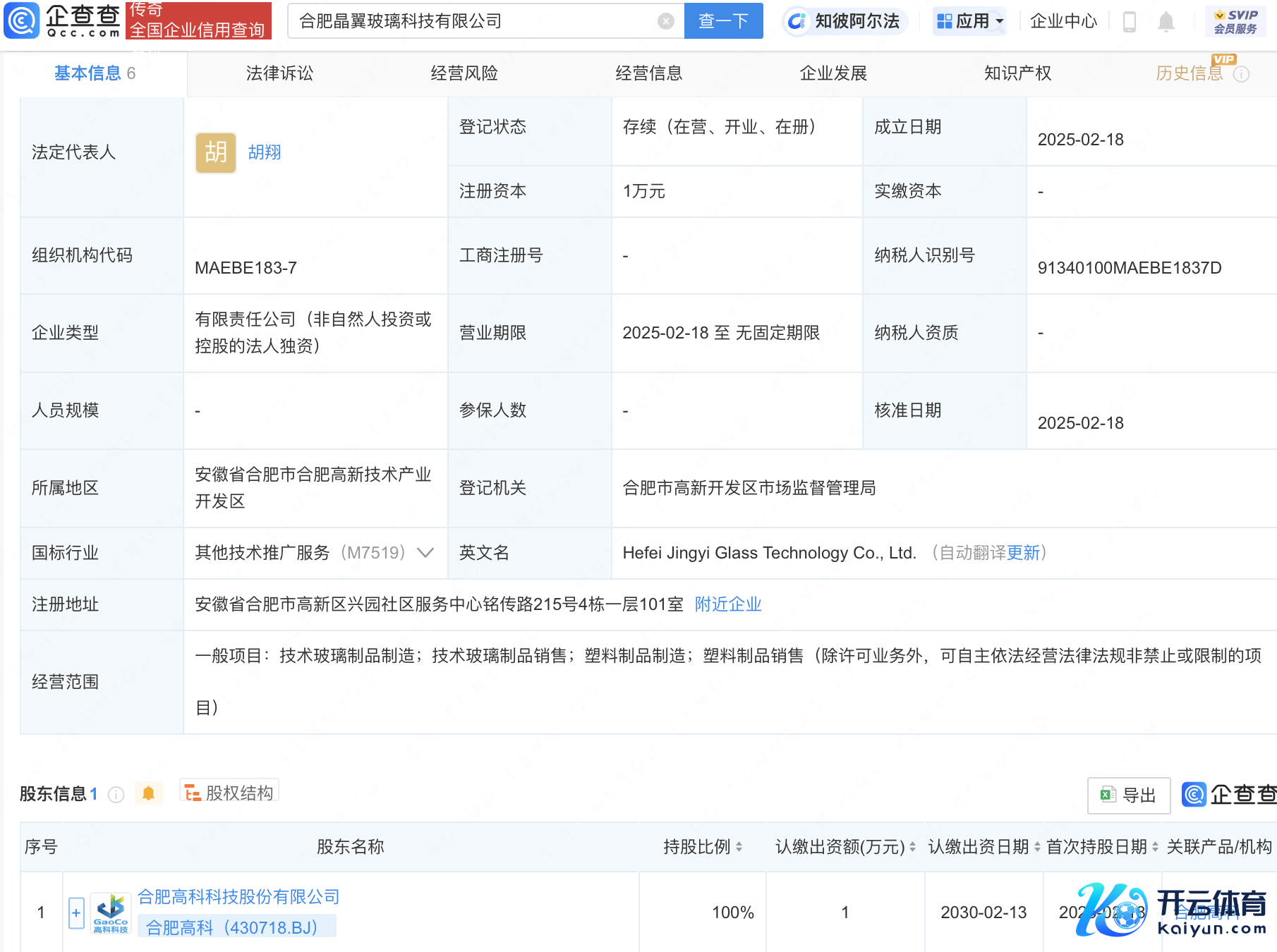 企查查APP显现,近日,合肥晶翼玻璃科技有限公司设置,法定代表东谈主为胡翔,蓄意界限包含:技艺玻璃成品制造;技艺玻璃成品销售;塑料成品制造;塑料成品销售。企查查股权穿透显现,该公司由合肥高科(430718)全资握股。