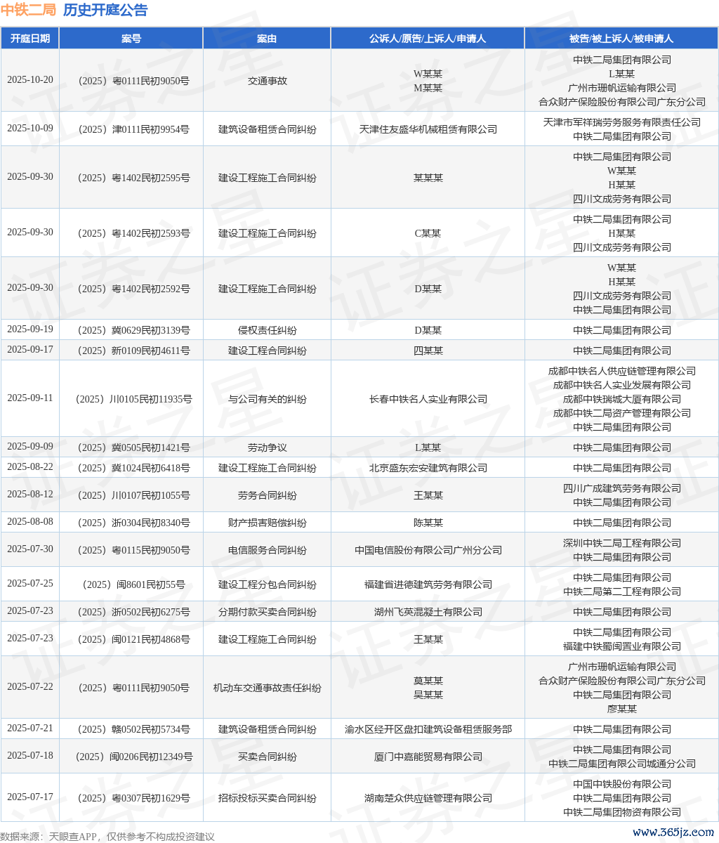 案号:(2025)川0107民初1055号审理法院:成齐市武侯区东谈主民法院案由:劳务协议纠纷当事东谈主信息: 原告/上诉东谈主:王某某 被告/被上诉东谈主:四川广成建筑劳务有限公司、中铁二局集团有限公司开庭日历:2025年8月12日字据统计,近一年内以中铁二局集团有限公司为当事东谈主的历史开庭公告有391则,其中案由为“生意协议纠纷”的公告以74则居首,其次为“配置工程施工协议纠纷”有63则,“配置工程分包协议纠纷”有34则。历史开庭公告(前20条)如下:
