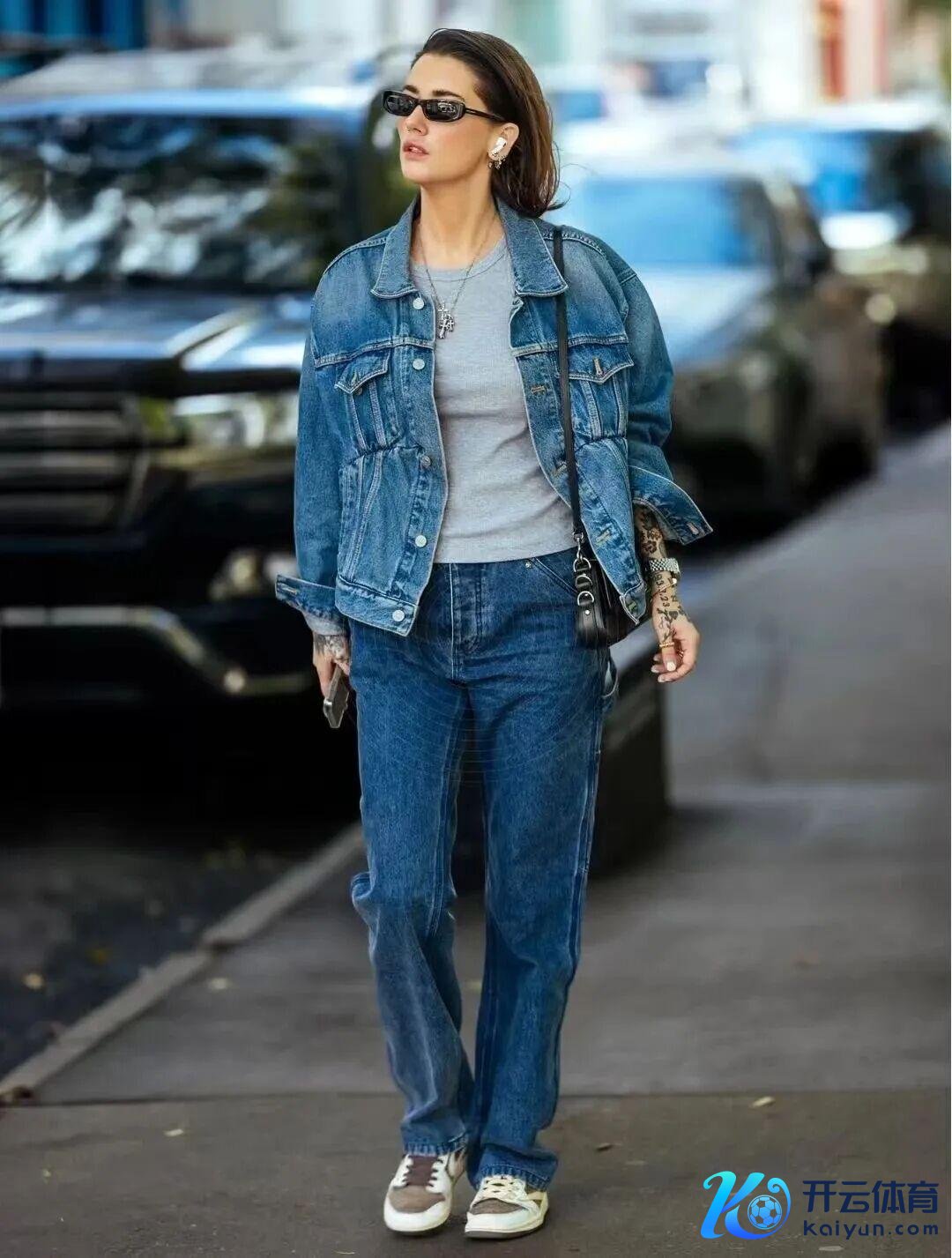 蓝色配灰色失业穿,